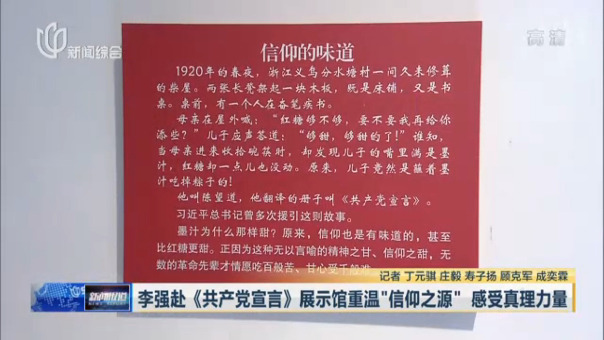 ? ? ? ? 1920年春,陳望道在浙江老家柴房苦譯《共產黨宣言》,曾將墨水誤作紅糖,吃下母親送來的粽子。“蘸著墨汁吃粽子,還說味道很甜”。這則被習近平總書記多次提及的故事“真理的味道”,在展廳中通過視頻播放。市領導在此駐足凝視,李強表示,在陳望道先生的舊居重溫“信仰之源”,確實深受觸動和啟迪,也感受到強大的真理力量,這對于我們不忘初心、牢記使命,把新時代中國特色社會主義推向前進,是一次深刻的教育。從歷史到現實,我們對馬克思和《共產黨宣言》的最好紀念,就是把習近平新時代中國特色社會主義思想這一當代中國馬克思主義研究好、宣傳好、貫徹好。